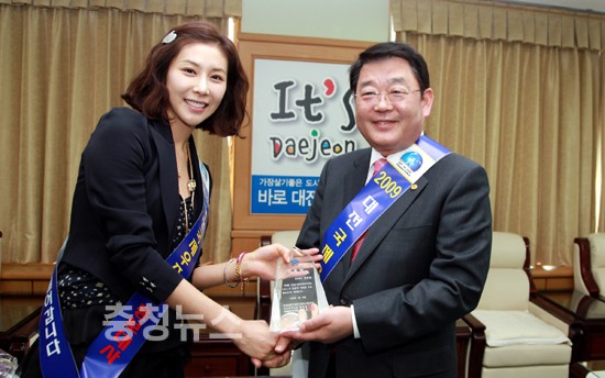 대전 출신의 영화배우 한은정 씨가 오는 10월 대전에서 열리는 국제우주대회(IAC) 홍보대사로 위촉됐다.한 씨는 26일 대전시청 응접실에서 '2009 대전국제우주대회 홍보대사 위촉식'에 참석해 박성효 시장으로부터 위촉패를 받았다.