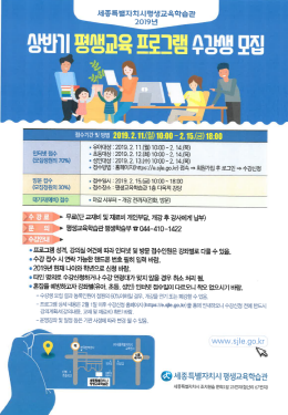 세종평생교육학습관은 「2019년도 상반기 평생교육 프로그램」 수강생을 내달 11일부터 모집한다고 밝혔다.