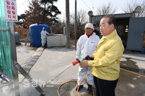 황선봉 예산군수가 지난 30일 구제역 거점소독시설(신례원 소재)을 점검하고 근무자를 격려하는 등 9년 연속 구제역 청정지역 사수를 위한 총력을 기울이고 있다.