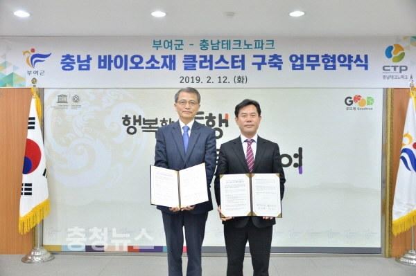 충남 부여군(군수 박정현)은 충남테크노파크(원장 윤종언)와 “충남 바이오소재 클러스터 구축사업”의 성공적인 추진을 위해 12일 부여군청에서 업무협약을 체결했다.