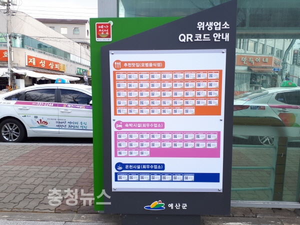또 위생업소별 대표 이미지, 소개 글, 안내전화연결, 위치 찾기 등록메뉴로 구성됐으며 예산군 홈페이지와 연동되도록 해 네트워크를 기반으로 한 예산군 위생업소 안내와 교류 역할도 하게 된다. 예산군 위생업소 QR코드 안내 서비스는 현재 예산터미널, 예산역, 예당국민관광지, 수덕사, 충의사, 추사고택 등 10개 지역에서 가능하다.