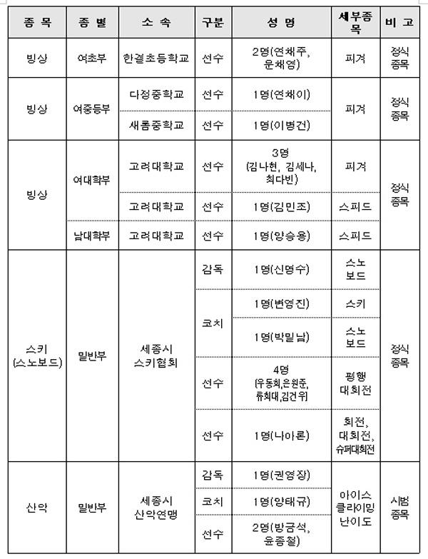 세종시의 선수단은 훈련장 시설이 열악한 상황에서도 설원과 은반위에서 굵은 땀방울을 흘리며 동계강화훈련에 매진하였으며, 할 수 있다는 자신감과 결연한 의지로 전국동계체육대회 승리를 다짐하고 있다.