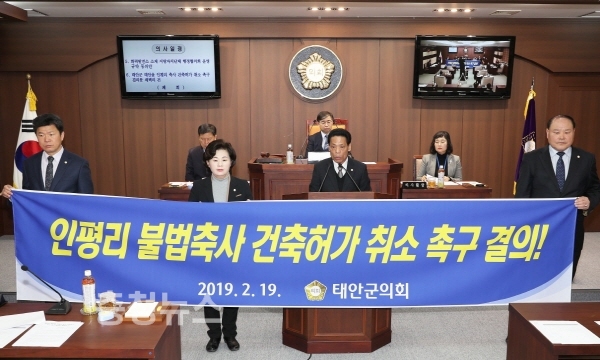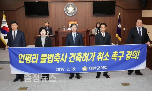 군의회는 19일 제257회 임시회 제6차 본회의에서 ‘태안군 태안읍 인평리 축사 건축허가 취소 촉구 결의안’을 안건으로 상정해 원안 가결했다.