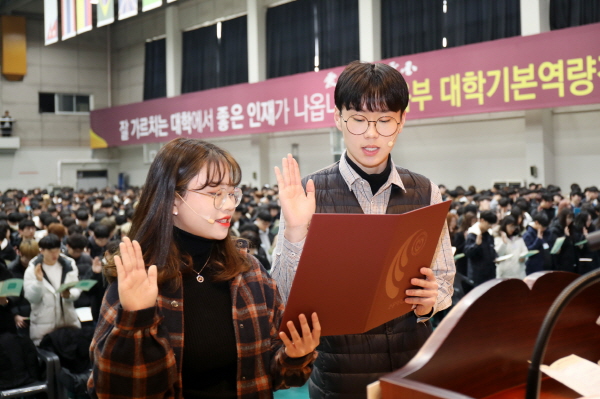 학생대표 서강준(외국어자율전공학부)과 최정인(글로벌한국학과)을 비롯한 신입생들은 “애천(愛天)∙애인(愛人)∙애국(愛國)의 건학이념을 중심으로 진리 탐구와 인격 연마에 힘쓰며, 본 대학교의 제반 규칙을 준수하고 성실히 면학에 정진할 것”을 선서했다.