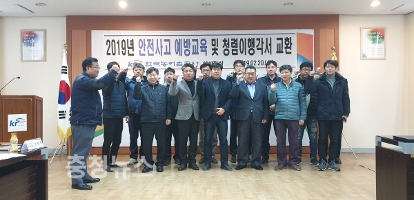 한국농어촌공사 아산지사(지사장 오병덕)는 20일 지사 회의실에서 지사장 이하 직원 및 공사담당자들과 함께 공사현장 청렴이행각서 교환 및 안전사고 예방교육을 실시했다.