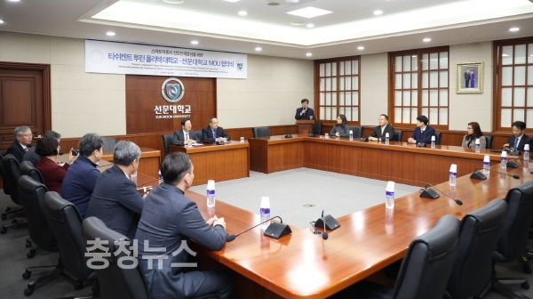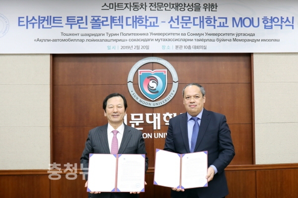 이를 위해 20일 선문대 스마트자동차공학부와 투린폴리텍대학는 선문대 본관 10층 대회의실에서 협약을 체결했다. 협약식에는 황선조 총장과 투린폴리텍대학의 모기업이면서 우즈베키스탄 국영기업인 오즈오트의 한국지사 대표 노프 바흐티야르가 참석했다.
