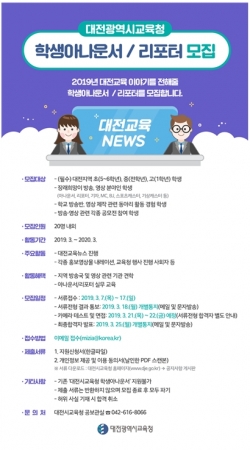 대전교육청은 이번 모집을 통해 선발된 학생아나운서/리포터는 대전교육 홍보콘텐츠를 현장형·교육가족 참여형으로 제작하고, 참여와 소통을 통해 대전교육 홍보를 활성화 할 계획이다.
