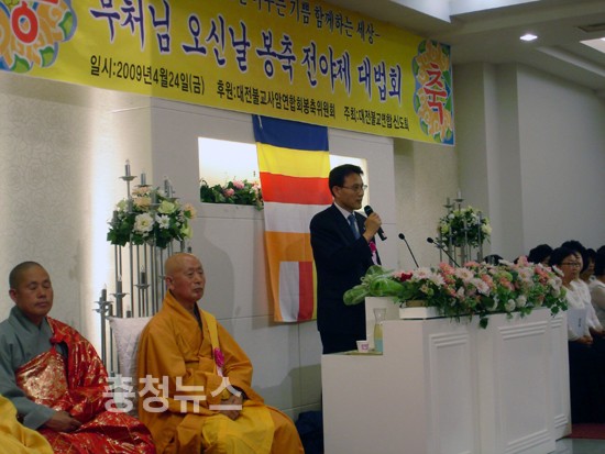 대전사암연합회 회장 도안스님이 부처님 오신날 봉축 전야제 대법회에 박성효 시장이 불참한 가운데 권선택, 염홍철 두 시장후보는 참석했다.