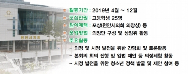 올 해 처음으로 출범하는 제1기 천안시 청소년의회는 25명으로 구성할 예정이며, 천안시에 거주하고 의회 활동에 관심이 있는 고등학생이면 학교장의 추천을 받아 지원이 가능하다.