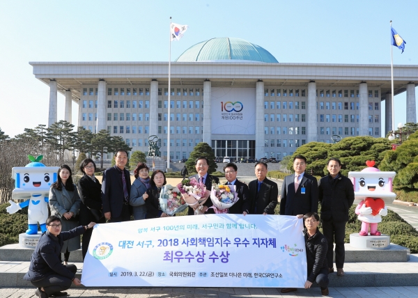 장종태 서구청장이 지난 22일 국회의원회관에서 진행된 ‘2018 대한민국 광역 및 기초 지방자치단체 사회책임지수 평가’ 에서 대전 5개 자치구 가운데, 1위를 차지해 최우수상을 수상했다.
