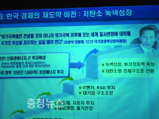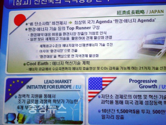이재환 이사장은 또 "저탄소 녹색성장 정책은 이명박 대통령이 슬로건으로 막연하게 내 세운게 아니라 21세기 대한민국의 성장동력인 저탄소 녹색 성장 정책은 다른나라보다 서둘러 시행하려는 것 있다"라고 소개했다.