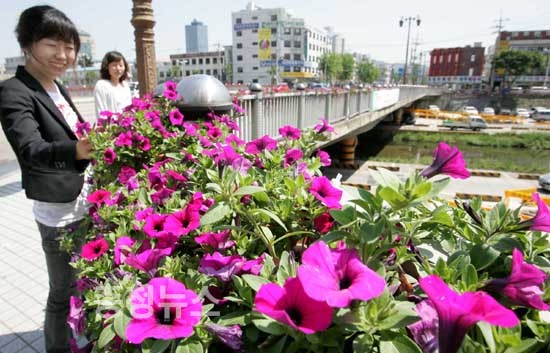 대전 동구(구청장 이장우)는 아름다운 꽃도시 이미지 제고를 위해 원동 대흥교에 페츄니아 2,230본이 심어진 사각화분을 설치, 꽃다리 조성으로 화사한 도시 분위기를 연출했다.