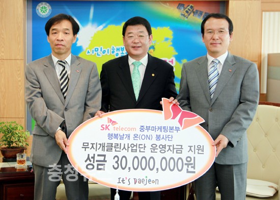 SK텔레콤 중부마케팅본부 김영수 본부장이 대전시가 추진 중인 무지개클린사업단에 3천만원을 기탁했다. 시는 26일 오전 김영수 본부장이 시청을 방문해 장애인 등 취약계층 일자리 창출을 위해 써달라며 운영성금 3천만원을 기탁했다고 밝혔다.