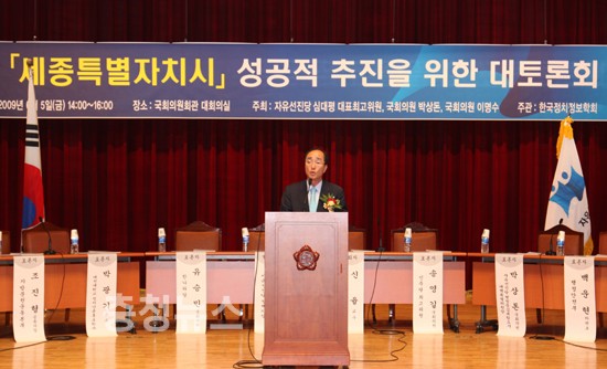자유선진당 심대평 대표가 6월 임시국회를 앞두고 세종특별시 관련 대토론회를 개최 세종특별자치시법 국회통과 의지와 정부이전기관 변경고시 조속이행을 강력히 촉구했다. 심대평 자유선진당 대표최고위원은 ‘세종특별자치시 성공적 추진을 위한 대토론회’ 를 같은 당 박상돈∙이명수 의원과 함께 공동주최 한국정치정보학회(회장 박광기 대전대 교수) 주관으로 5일 오후 2시 국회의원회관 대회의실에서 개최했다.