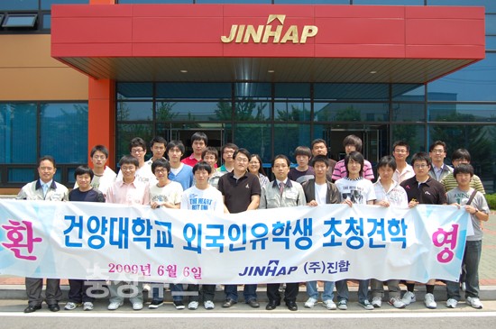 대전지역의 자동차부품 제조회사인 주식회사 진합은 6월 6일 건양대학교 공과대학에 유학중인 공학도 30여명을 초청하여 생산라인 및 제조공정을 소개하고 오찬을 겸한 간담회를 실시했다.