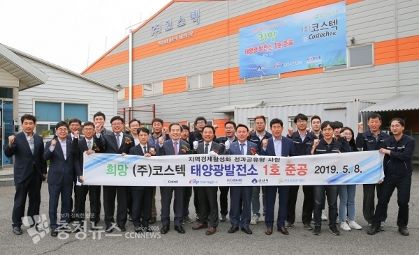 한국서부발전(사장 김병숙)은 8일(수) 군산시(시장 강임준), 중소벤처기업진흥공단(전북서부지부장 김근영)과 성과공유형 태양광발전설비 설치사업의 참여기업인 ㈜코스텍을 방문, ‘군산 태양광 희망발전소 1호 준공기념식’을 개최했다.