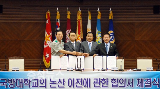 ▲ 국방부와 국방대학교는「국방대학교 논산이전」관련 2007년 12월 11일 국가균형발전위원회의 결정 및 2008년 12월 13일 국회 예산결정을 존중하여, 원칙적으로 국방대학교를 논산으로 이전하며,
