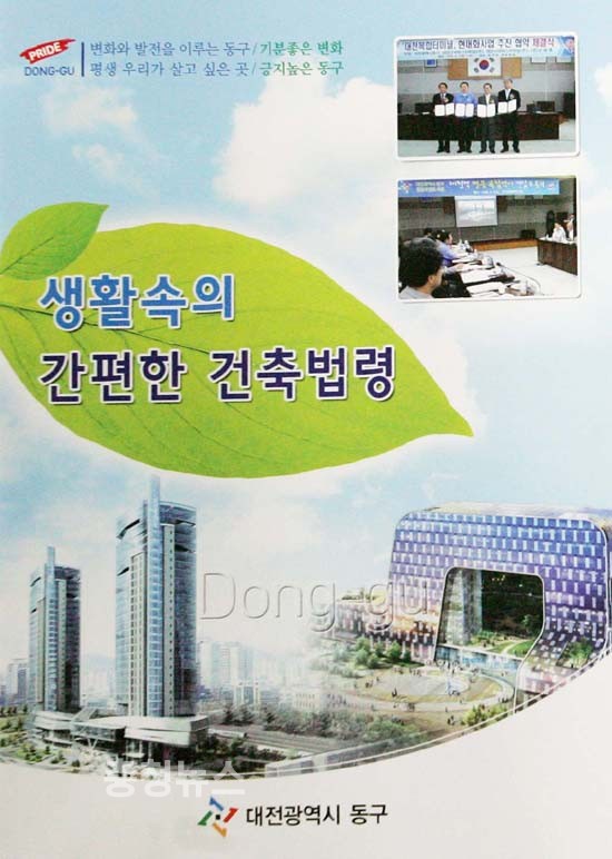 대전 동구(구청장 이장우)가 건축 인.허가 내용를 알기 쉽게 담은 ´생활 속의 간편한 건축법령´ 안내문 1천부를 제작했다. 구는 22일 방대하고 복잡한 건축법을 알기 쉽게 정리, 홍보함으로써 시민의 이해를 돕고자 안내문을 제작, 배부했다고 밝혔다.