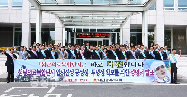 성명서에서 시의원들은 "첨단의료복합단지는 국가의 장래를 견인할 중차대한 사업인 만큼 가장 합리적으로 객관적인 기준에 따라 공정하고 투명한 평가가 이뤄져야 할 것"이라며 "최적의 연구역량과 인프라를 갖춘 대덕연구개발특구의 대전시는 최단기간 최소비용으로 최대효과가 가능한 유일한 도시"라고 강조했다.