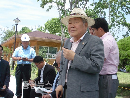 ▲ 이인구 명예회장이 기자들에게 공원소개를 하고 있다.