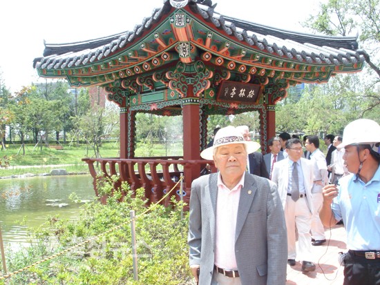 ▲ 이인구 명예회장이 한반도 모양의 반도지(연못)에서............