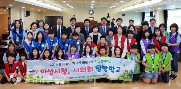 20일 ‘2019 아산시민학교’운영프로그램으로 아산 쌍룡초등학교 4학년 1반 학생들과 교사 30여명이 아산시의회를 탐방하고 견학하는 기회를 가짐으로 학교 교과서에서만 배웠던 지방의회를 방청하고 의회역할과 의사진행흐름을 이해하는 시간을 가졌다.