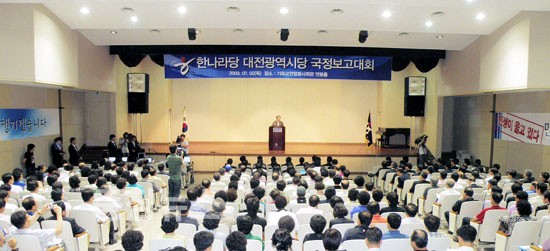 한나라당 대전시당는 2일 오후2시 중구 기독교연합봉사회관에서 당원들을 대상으로 국정보고대회를 열고한나라당이 6월 임시국회에서 추진중인 미디어법과 4대강을 정비 적극 홍보했다.