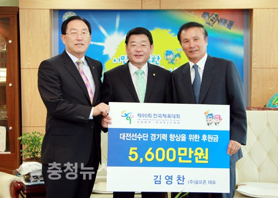 (주)골프존 김영찬 대표는 7일 오후 대전시청을 방문해 오는 10월 대전에서 개최되는 제90회 전국체전 성공개최와 우수선수 발굴육성 및 경기력 향상을 위해 써달라며 후원금 5천6백만원을 대전시체육회 회장인 박성효시장에게 전달했다.