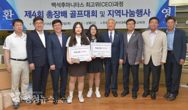 백석대학교(총장 장종현)ㆍ백석문화대학교 평생교육원에서 운영하는 백석후마니타스 최고위(CEO)과정은 30일(목) 천안 상록CC에서 개최된 총장배 골프대회에서 지역 고등학생 2명에게 장학금 총 2백만 원을 전달했다.