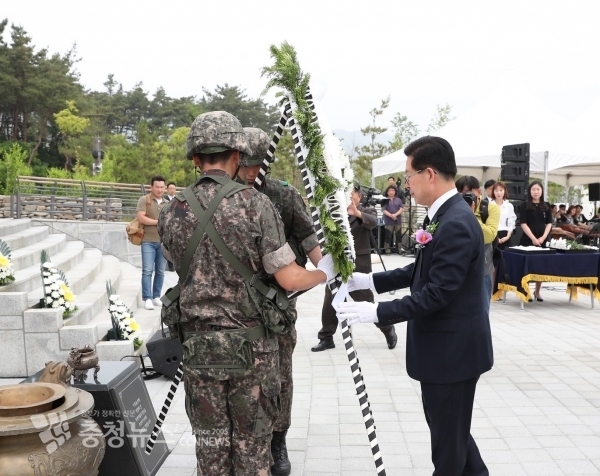 양승조 충남도지사가 6일 충남보훈공원에서 열린 제64회 현충일 추념식에서 헌화하고 있다.