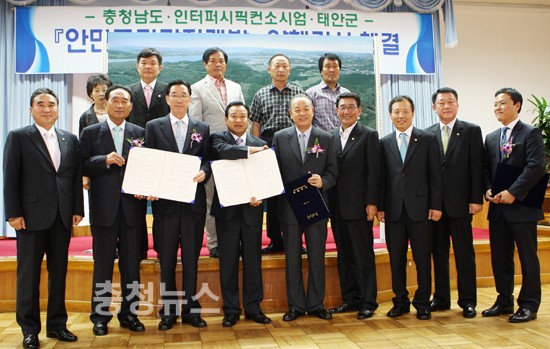 충남도는 28일 오후 도청 대회의실에서 인터퍼시픽컨소시엄 이만규 대표, 에머슨퍼시픽그룹 이중명 회장, 진태구 태안군수와 안면도관광지개발을 위한 양해각서를 체결했다.