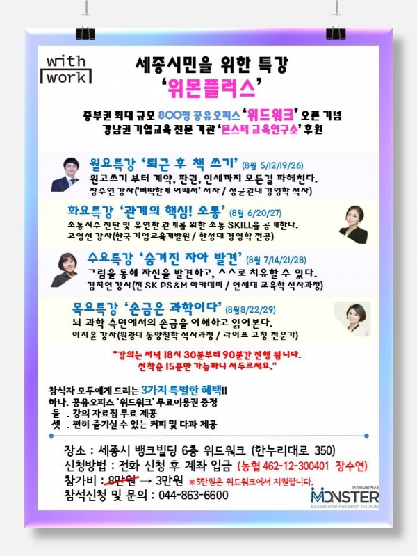 한편 이번 ‘위몬플러스’ 특강에는 참석자 모두에게 공유오피스 무료이용권 증정과 강의 자료집 무료제공, 커피 및 다과가 제공될 예정이다.