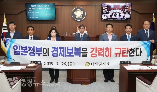 태안군의회 의원 7명은 26일 태안군의회 본회의장에서 열린 제261회 임시회 제5차 본회의에서 결의문을 낭독하고 일본 정부의 반도체‧디스플레이 핵심소재 등 수출규제 강화 조치의 즉각적인 철회를 촉구했다.
