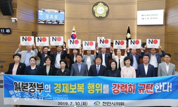 천안시의회(의장 인치견) 는 30일 열린 제224회 임시회 제1차 본회의에서 한일관계를 훼손하는 일본정부의 불합리한 경제보복 조치에 대한 규탄 결의안을 채택했다.