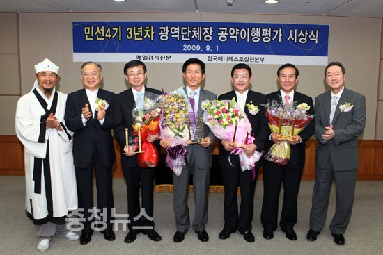 ▲ 김명곤 한국메니페스토실천본부 홍보대사(청학동서당 훈장), 강지원 한국메니페스토실천본부 상임대표,강기창 강원도 행정부지사, 김문수 경기도지사, 박성효 대전시장, 서필언 행정부시장, 매일경제신문 장대환 대표