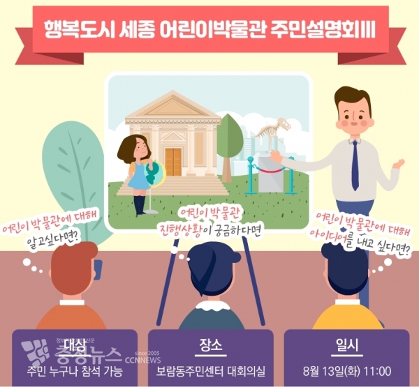 행정중심복합도시건설청(청장 김진숙)은 세종시 어린이박물관의 건립 현황을 시민들에게 설명하고 의견을 수렴하기 위해 13일(화) 오전 11시 보람동 주민센터에서 약 1시간 동안 설명회를 진행한다.