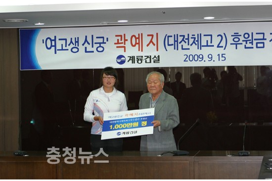 계룡건설 관계자는 “곽예지 선수가 어려운 환경속에서 꿋꿋이 성장해 훌륭한 선수로 자란 점을 높이 평가해 대전광역시체육회에서 추진하는 ‘1사1선수 후원제’ 차원으로 이번에 후원금을 전달했다”고 밝혔다.