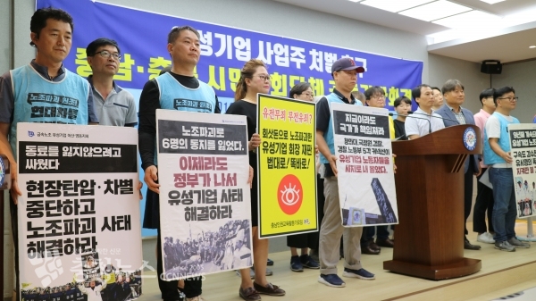 유성기업 사업주 처벌 촉구 충남·충북 시민사회단체는 27일 충남도청 브리핑룸에서 기자회견을 열고 “노동자의 기본권을 파괴한 유 회장에게 솜방망이 처벌을 내리지 말라”고 사법부에 촉구했다.