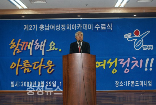 이날 수료식은 지난 9월 15일 『함께해요. 아름다운 여성정치!!』 라는 슬로건 아래 충청남도 전역의 여성리더 130명을 대상으로 개강하여 다가오는 2010년 지방선거에서 능력 있고 진취적인 여성계 인사의 정계진출 확대를 위한 준비와 함께 여성들의 적극적 정치참여를 통한 대한민국 정치발전을 모색하고자 실시되었던 한나라당 여성정치아카데미 2기를 마무리하는 자리다.