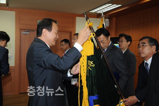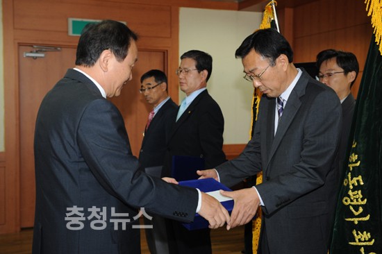 ▲ 충남도가 산림행정 부문 "최우수기관”으로 선정되어 5일 정부대전청사 대회의실에서 김영수 도 산림녹지과장(우측)이 정광수 산림청장(좌측)으로부터 표창을 전달받고 있다.