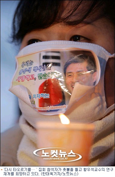 황우석 교수를 지지하는 촛불은 주일에도 꺼지지 않았다. 14일 오후 서울 광화문 동화면세점 앞에서 열린 황우석 교수를 지지하는 촛불문화행사에는 인터넷 까페 회원 등 시민 1천500여 명이 참석해 황 교수의 연구 재개를 요구했다. 이들은 이 자리에서 "황우석 교수를 둘러싼 모든 의혹이 가려지고 황 교수의 연구가 재개돼 줄기세포 원천 기술을 지켜내야 한다"며 "서울대 정운찬 총장이 모든 책임을 지고 사퇴할 것"을 주장했다. 이 자리에는 한국척수장애인협회 회원들이 휠체어를 탄 채 참석하기도 했으며 황 교수의 얼굴이 새겨진 티셔츠를 맞춰입은 참가자들의 모습도 눈에 띄었다.