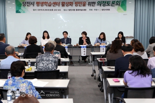 당진시의회(의장 김기재)는 25일 당진시청 중회의실에서 김기재 당진시의회 의장을 비롯한 시의원들과 평생교육 관련 전문가, 당진시민, 공무원 등 중회의실을 가득 메운 가운데‘평생학습센터 활성화 방안을 위한 토론회’를 개최했다.