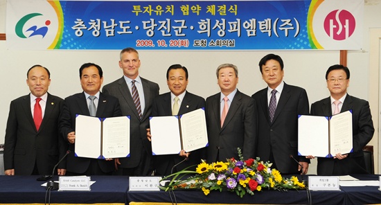 충남도와 당진군은 20일 도청 소회의실에서 이완구 충남도지사와 민종기 당진군수, 구본능 희성그룹회장, BASF사의 프랭크 보지크(Frank Bozich) 부사장, 최성희 희성그룹부회장, 손대성 희성피엠텍사장이 참석한 가운데 BASF사와 합작한 희성피엠텍(주)과 당진군 입주를 위한 투자협약을 체결했다.