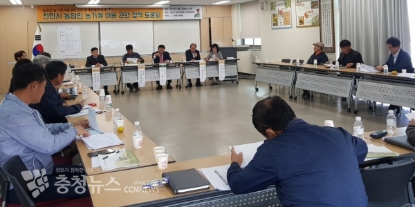 천안시의회(의장 인치견) 의원들로 구성된 ‘천안시의회 농기계임대사업 합리화 의정연구회’(허욱 의원, 안미희 의원, 김철환 의원, 육종영 의원)은 15일 천안시농업기술센터 회의실에서 ‘천안시 농업인 농기계 이용 관련 정책토론회’를 개최했다.