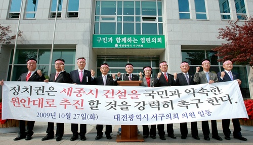 대전 서구의회(의장 남재찬)가 정부의 세종시 건설 및 국토균형발전 전면 축소 사태를 규탄하기 위해 ‘세종시 건설 원안추진 촉구결의문’을 채택했다.