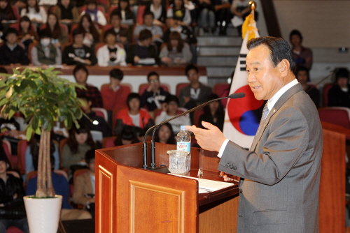 이완구 도지사가 28일 오전 단국대학교 천안캠퍼스(총장 장충식) 학생회관에서 학생, 교직원 등 650여명이 참석한 가운데 '미래를 향해 준비하는 젊은이들의 도전'이란 주제로 특강을 실시했다.