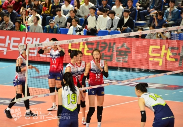 1셋트는 인삼공사 최은지 선수의 첫 공격 득점과 강서브 포인트, 현대건설의 공격 실패로 3대0 으로 순조롭게 출발했다.