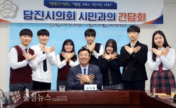 당진시의회 김기재의장은 25일 시의회 대회의실에서 당진청소년 평화나비(회장 김나민, 당진고3) 임원 및 시의회 관계공무원 등 총20여 명이 참석한 가운데 간담회를 가졌다.