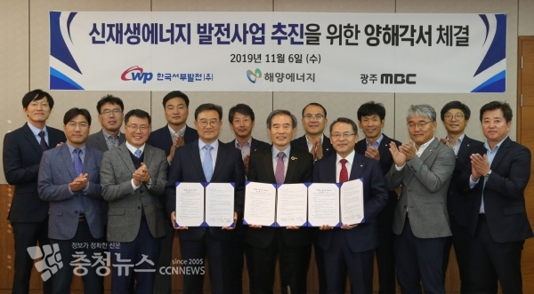 한국서부발전(사장 김병숙)은 6일 광주·전남지역 도시가스 공급사인 ㈜해양에너지․광주MBC와 함께 ‘신재생에너지 발전사업 추진 양해각서’를 체결했다.