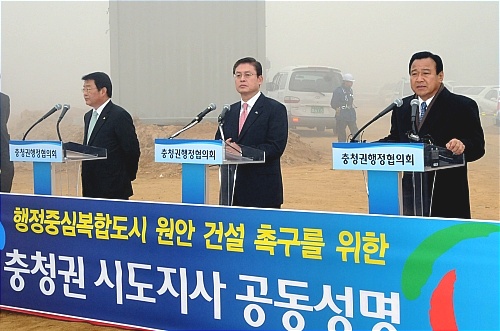 최근 세종시 수정 움직임으로 혼란이 지속되고 있는 가운데 대전시. 충남.북 등 충청권 3개 시·도지사가 행정중심복합도시 원안 건설 촉구를 위해 한자리에 모였다.